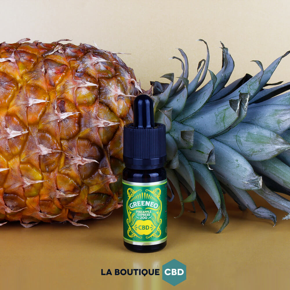 Un e-liquide CBD aux saveurs exotiques, arborant un goût d’ananas tropical élaboré à partir des terpènes naturels de chanvre de la variété Pineapple Express.